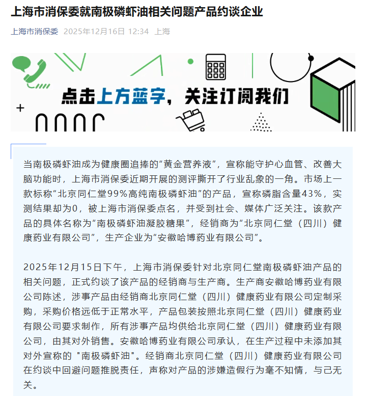 12月16日,上海市消费者权益保护委员会(简称“上海市消保委”)发文称,市场上一款标称“北京同仁堂99%高纯南极磷虾油”的产品,宣称磷脂含量43%,实测结果却为0,已于昨天(15日)约谈了该产品的经销商与生产商。