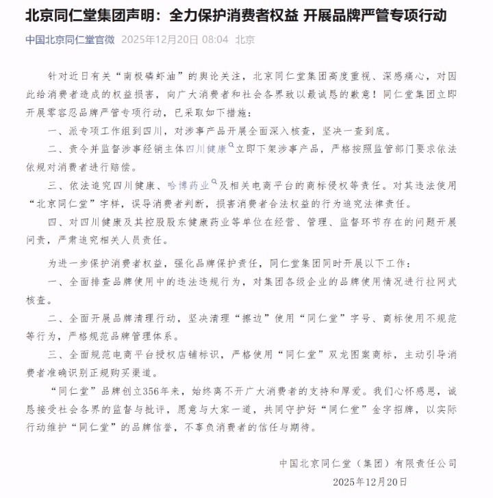 12月20日上午,同仁堂集团发布致歉声明称,针对近日有关“南极磷虾油”的舆论关注,集团对因此给消费者造成的权益损害,向广大消费者和社会各界致以最诚恳的歉意。