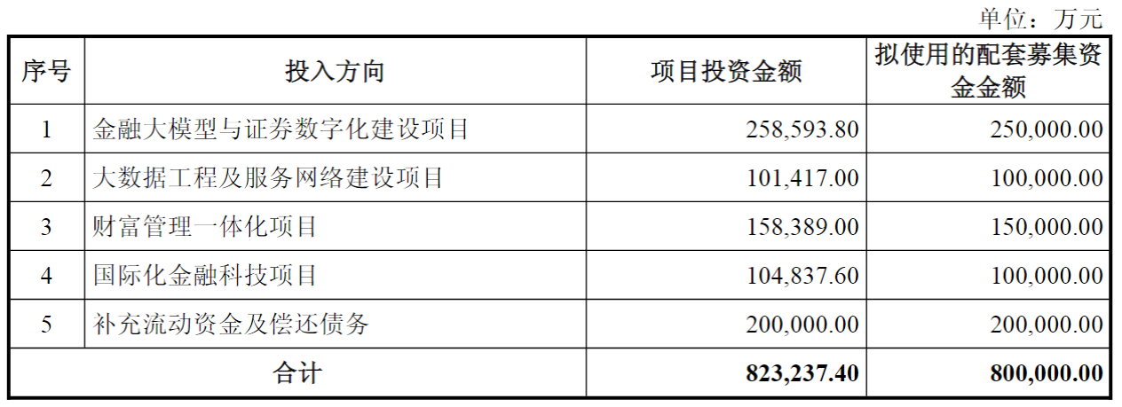 从投入方向来看,拟使用配套募集资金25亿元用于金融大模型与证券数字化建设项目,拟投入10亿元用于大数据工程及服务网络建设项目,财富管理一体化项目拟投入15亿元,国际化金融科技项目拟投10亿元,补充流动资金及偿还债务则拟使用20亿元。
