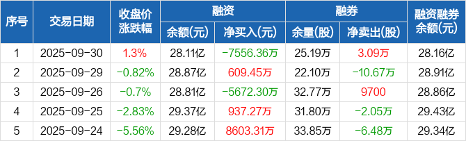 上汽集团:融资净偿还7556.36万元,融资余额28.11亿元(09-30)