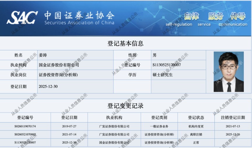公开资料显示,姜涛拥有武汉大学金融工程学士、硕士学位。加入国金证券前,他一直在广发证券任职。2018年起,姜涛从事环保行业研究;2022年开始,涉足公用事业行业研究。