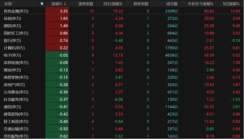 有色金属、环保、钢铁、军工、银行、计算机板块逆势飘红。电子板块早盘一度跌近5%,但在强势反弹下将跌幅收缩至0.05%,且有9只相关个股涨停。