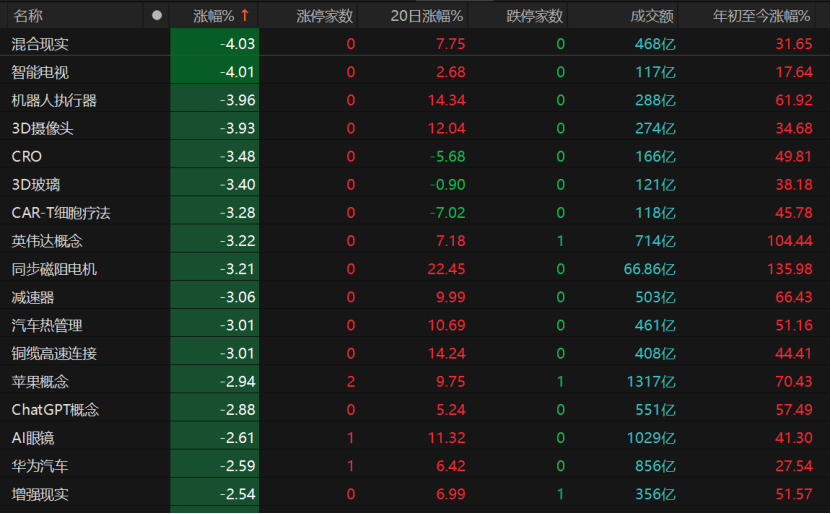 混合现实、机器人执行器、CRO、CAR-T细胞疗法、英伟达概念、同步磁阻电机、减速器等概念跌幅超过3%。