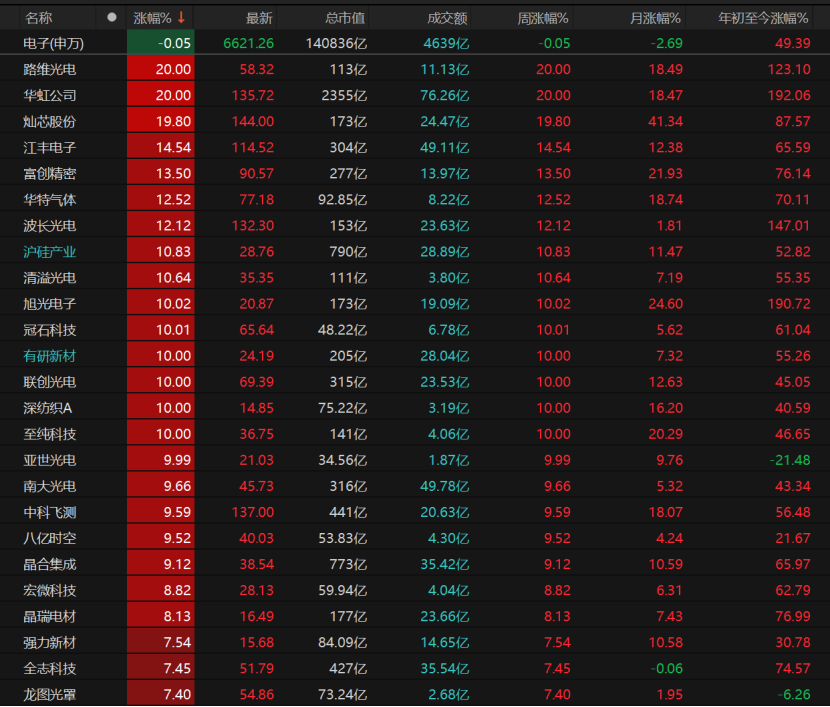 路维光电、华虹公司“20cm”涨停,冠石科技、有研新材、联创光电等个股涨停。