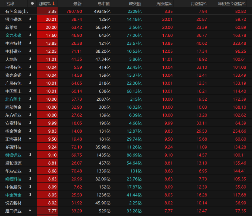 有色金属板块领涨,银河磁体、新莱福“20cm”涨停,金力永磁收涨17.6%报46.9元/股,中国稀土、西部黄金涨停。
