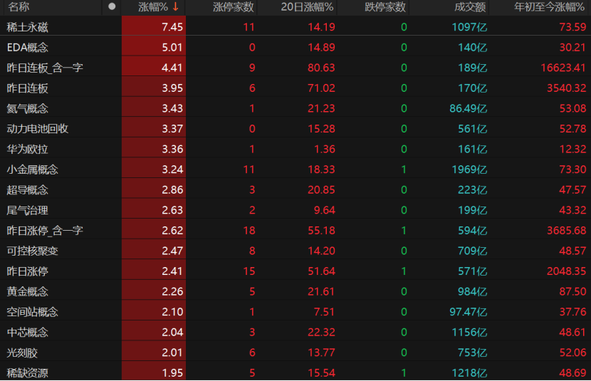 稀土永磁、氦气概念、动力电池回收、华为欧拉、小金属概念、超导概念、可控核聚变等概念领涨。