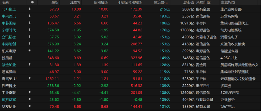 市场亏钱效应明显。个股跌多涨少,共计1684只个股收涨,涨停股73只;3634只个股收跌,跌停股10只。今日成交额超过100亿元的个股共计15只,北方稀土放量涨停,中芯国际收涨6.66%报136.47元/股,华友钴业收涨8.68%报70.48元/股。