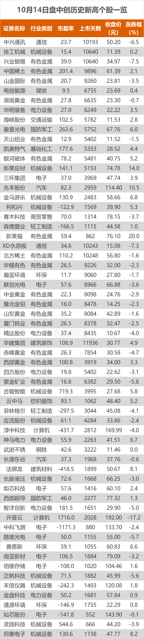 10月14日,A股三大指数今日集体回调,截止收盘,沪指跌0.62%,收报3865.23点;深证成指跌2.54%,收报12895.11点;创业板指跌3.99%,收报2955.98点。东方财富Choice数据显示,今日有62只个股盘中股价创历史新高,分别为北方稀土、合锻智能等。