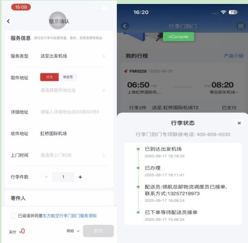 旅客乘机出行时,经常会遇到“路途中携带大件行李”“商务出行拖着行李赶会议”等痛点,东航提供的“行李门到门”服务直击旅客核心需求,旅客通过东航APP提前预约,即可享受专业人员上门取件,将行李直接运至出发机场(“门到港”服务),或从到达机场直接送回家中(“港到门”服务),省去了自己在机场办理托运和提取的烦琐手续,让旅客从出发到目的地,全程无需接触自己的托运行李,真正“解放双手”。