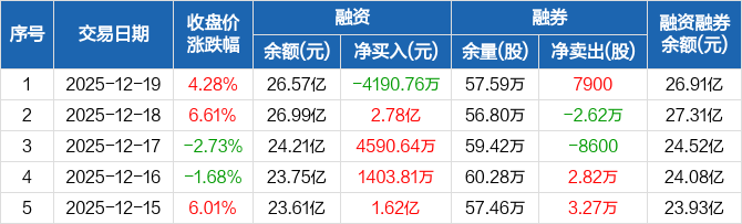 中国卫星:融资净偿还4190.76万元,融资余额26.57亿元(12-19)