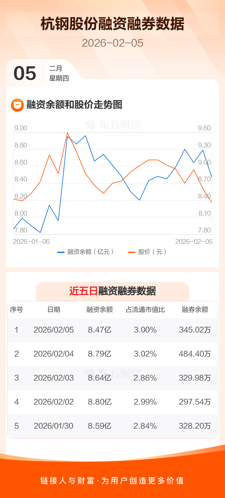 交易所最新数据显示,杭钢股份于2026年2月5日获融资买入2684.21万元,融资偿还5814.99万元,当日融资净偿还3130.78万元。目前,该股融资余额8.47亿,占流通市值比例为3.00%。