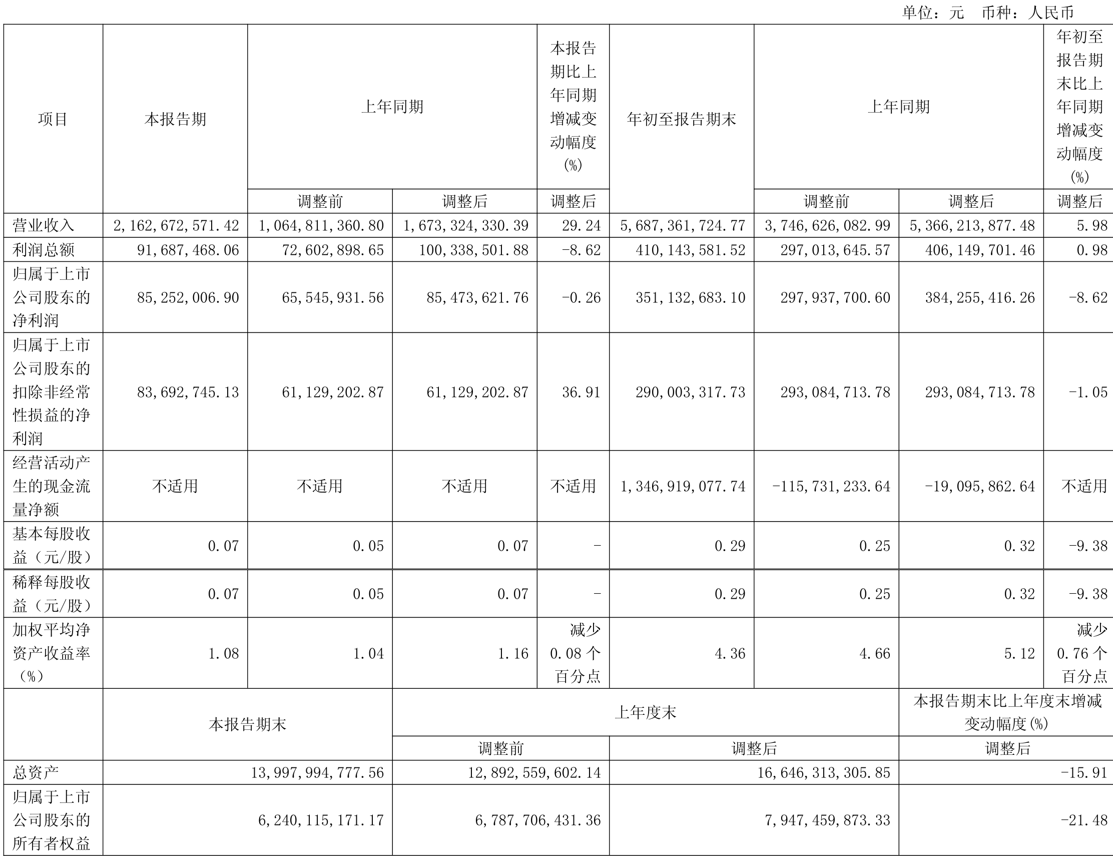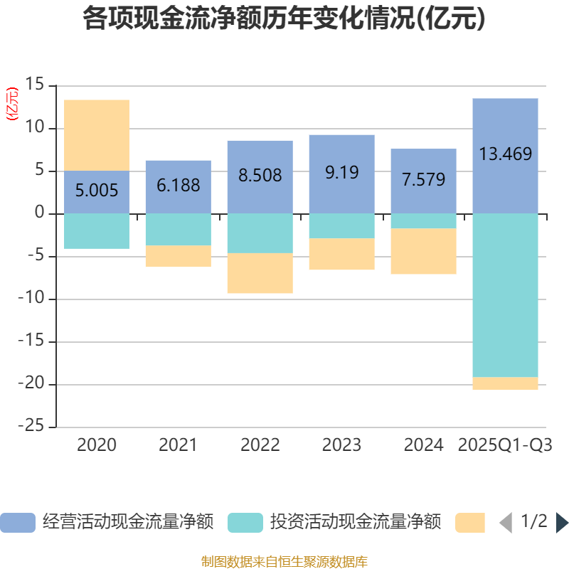 2025年前三季度,公司经营活动现金流净额为13.47亿元,同比增加13.66亿元;筹资活动现金流净额-1.46亿元,同比增加2.51亿元;投资活动现金流净额-19.21亿元,上年同期为968.8万元。