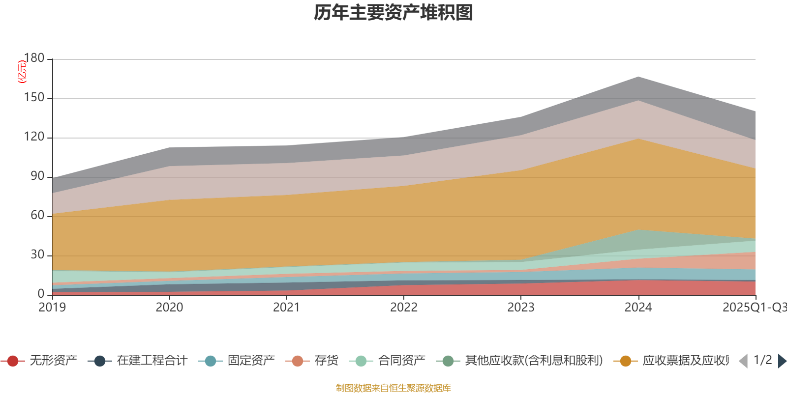 资产重大变化方面,截至2025年三季度末,公司其他应收款(含利息和股利)较上年末减少89.49%,占公司总资产比重下降8.03个百分点;存货较上年末增加98.72%,占公司总资产比重上升5.53个百分点;应收票据及应收账款较上年末减少22.93%,占公司总资产比重下降3.48个百分点;预付款项较上年末增加83.74%,占公司总资产比重上升2.47个百分点。
