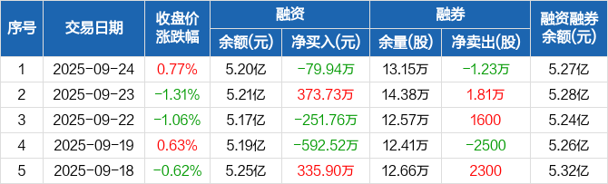 重庆啤酒:融资净偿还79.94万元,融资余额5.2亿元(09-24)
