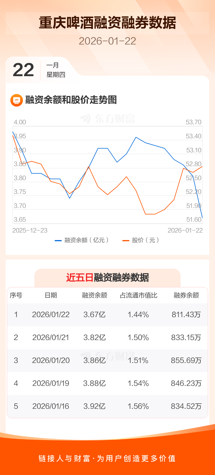 交易所最新数据显示,重庆啤酒于2026年1月22日获融资买入265.33万元,融资偿还1745.69万元,当日融资净偿还1480.35万元。目前,该股融资余额3.67亿,占流通市值比例为1.44%。