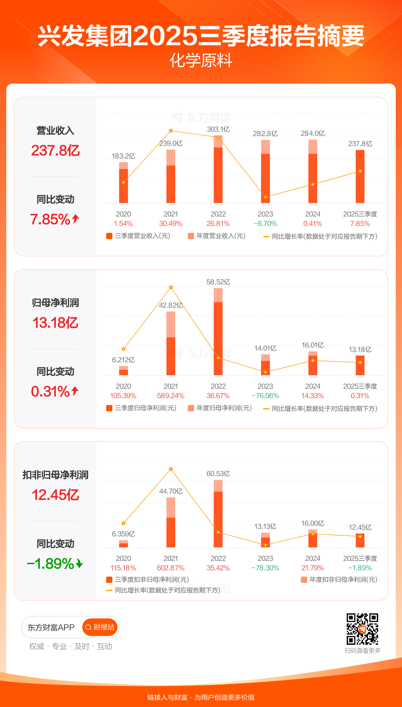 兴发集团10月28日发布2025年三季报显示,公司前三季实现营业收入237.81亿元,同比增长7.85%;归母净利润13.18亿元,同比增长0.31%;扣非归母净利润12.45亿元,同比下滑1.89%。
