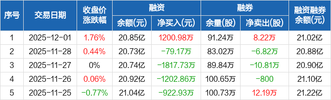 融资方面,当日融资买入1.32亿元,融资偿还1.2亿元,融资净买入1200.98万元。融券方面,融券卖出10.19万股,融券偿还1.97万股,融券余量91.24万股,融券余额1687.02万元。融资融券余额合计21.02亿元。