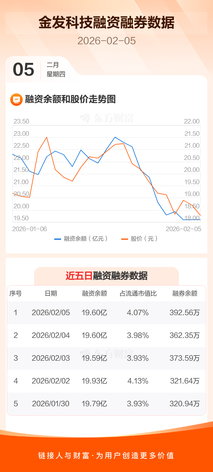 交易所最新数据显示,金发科技于2026年2月5日获融资买入6608.56万元,融资偿还6585.96万元,当日融资净买入22.6万元。目前,该股融资余额19.60亿,占流通市值比例为4.07%。