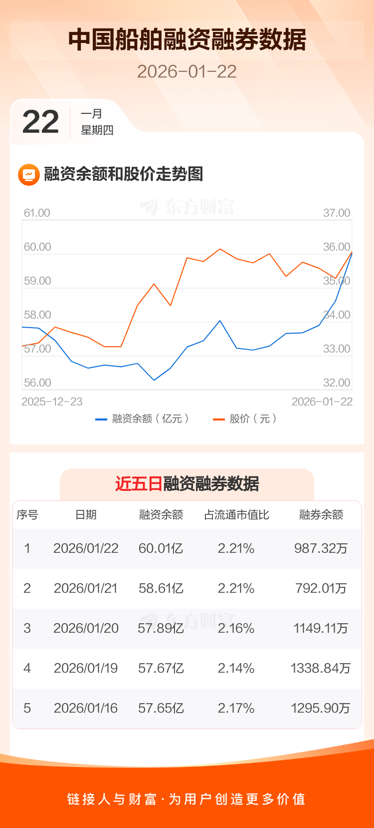 交易所最新数据显示,中国船舶于2026年1月22日获融资买入5.97亿元,融资偿还4.51亿元,当日融资净买入1.46亿元。目前,该股融资余额60.01亿,占流通市值比例为2.21%。