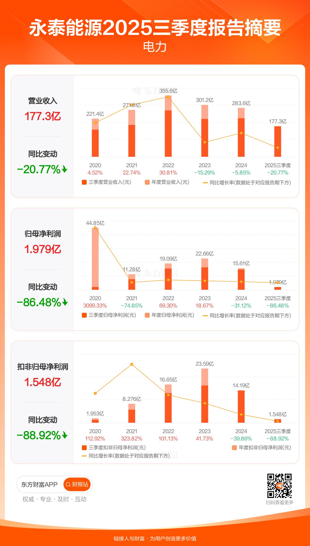 永泰能源10月30日发布2025年三季报显示,公司前三季实现营业收入177.28亿元,同比下滑20.77%;归母净利润1.98亿元,同比下滑86.48%;扣非归母净利润1.55亿元,同比下滑88.92%。
