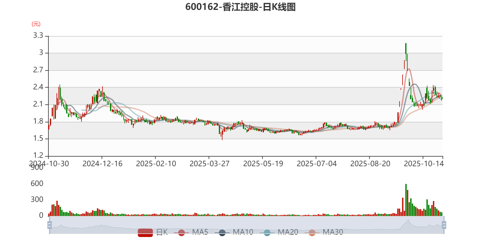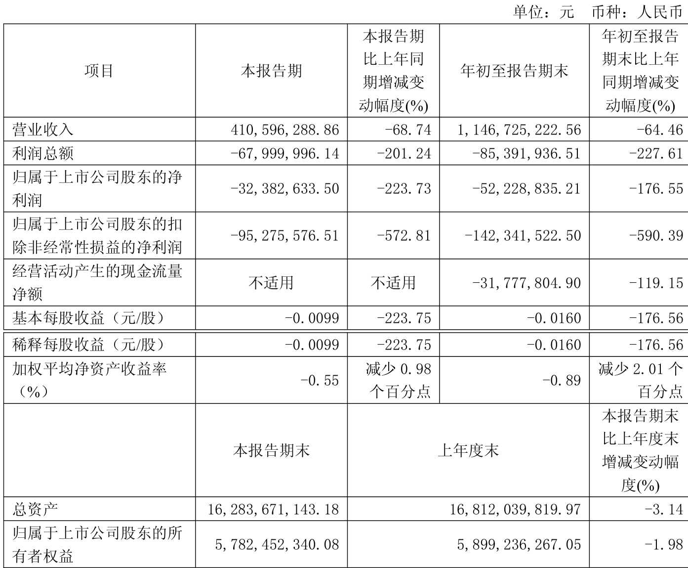 中证智能财讯香江控股(600162)10月30日披露2025年第三季度报告。前三季度公司实现营业总收入11.47亿元,同比下降64.46%;归母净利润亏损5222.88万元,上年同期盈利6823.16万元;扣非净利润亏损1.42亿元,上年同期盈利2902.62万元;经营活动产生的现金流量净额为-3177.78万元,上年同期为1.66亿元;报告期内,香江控股基本每股收益为-0.016元,加权平均净资产收益率为-0.89%。