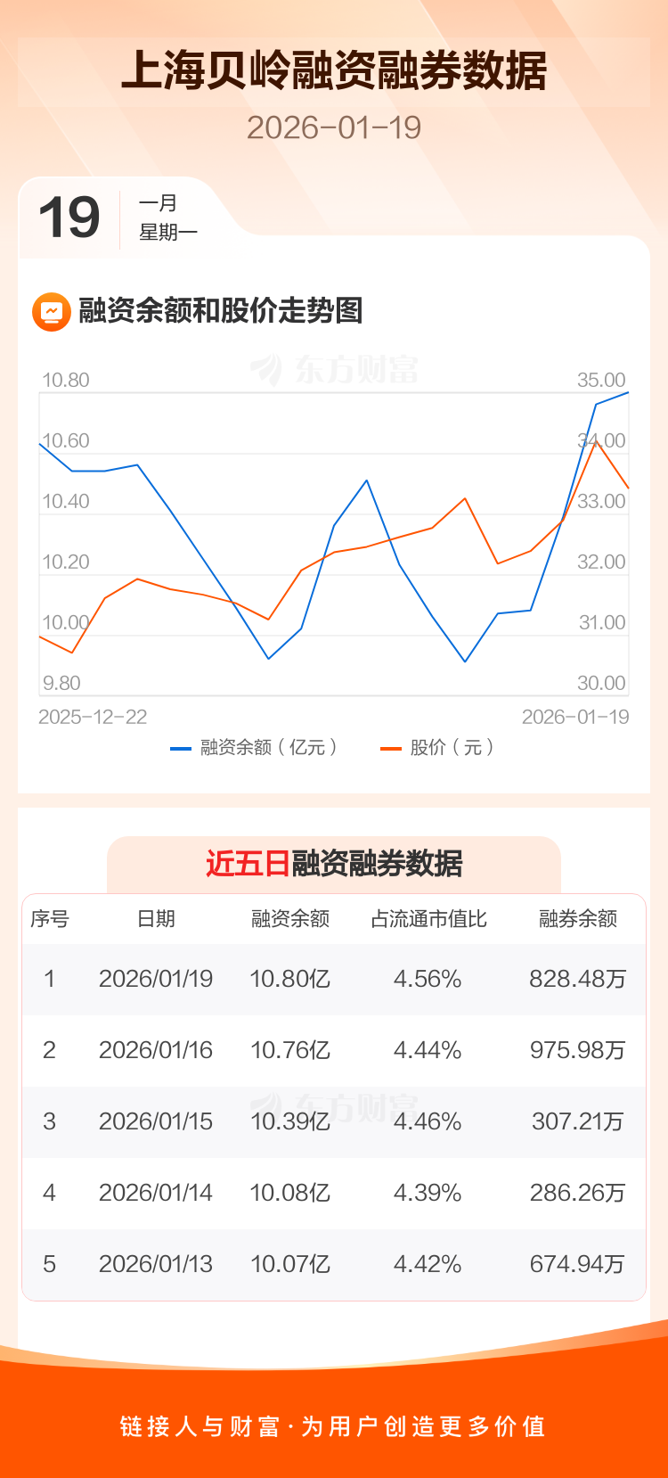 交易所最新数据显示,上海贝岭于2026年1月19日获融资买入9806.06万元,融资偿还9444.46万元,当日融资净买入361.6万元。目前,该股融资余额10.80亿,占流通市值比例为4.56%。