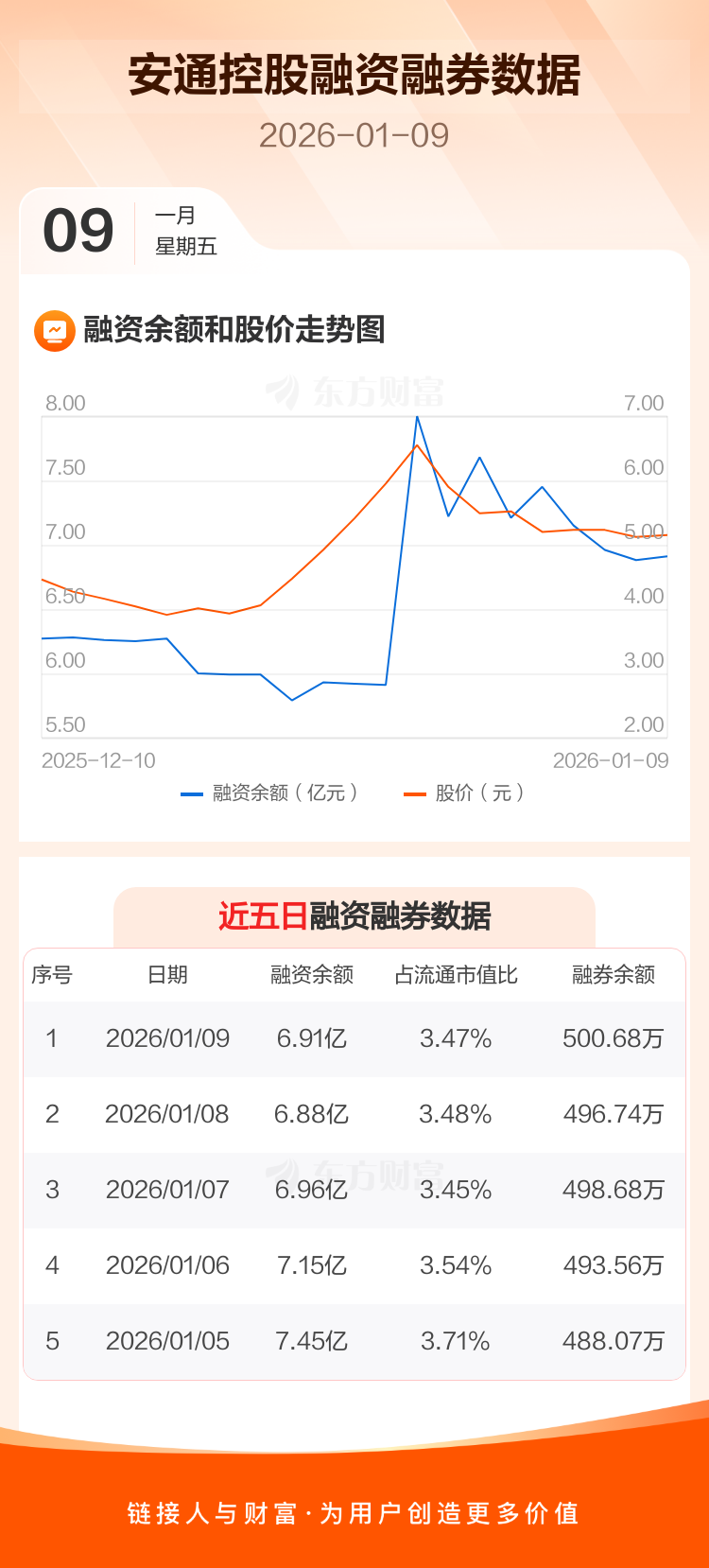 交易所最新数据显示,安通控股于2026年1月9日获融资买入6017.27万元,融资偿还5690.84万元,当日融资净买入326.43万元。目前,该股融资余额6.91亿,占流通市值比例为3.47%。
