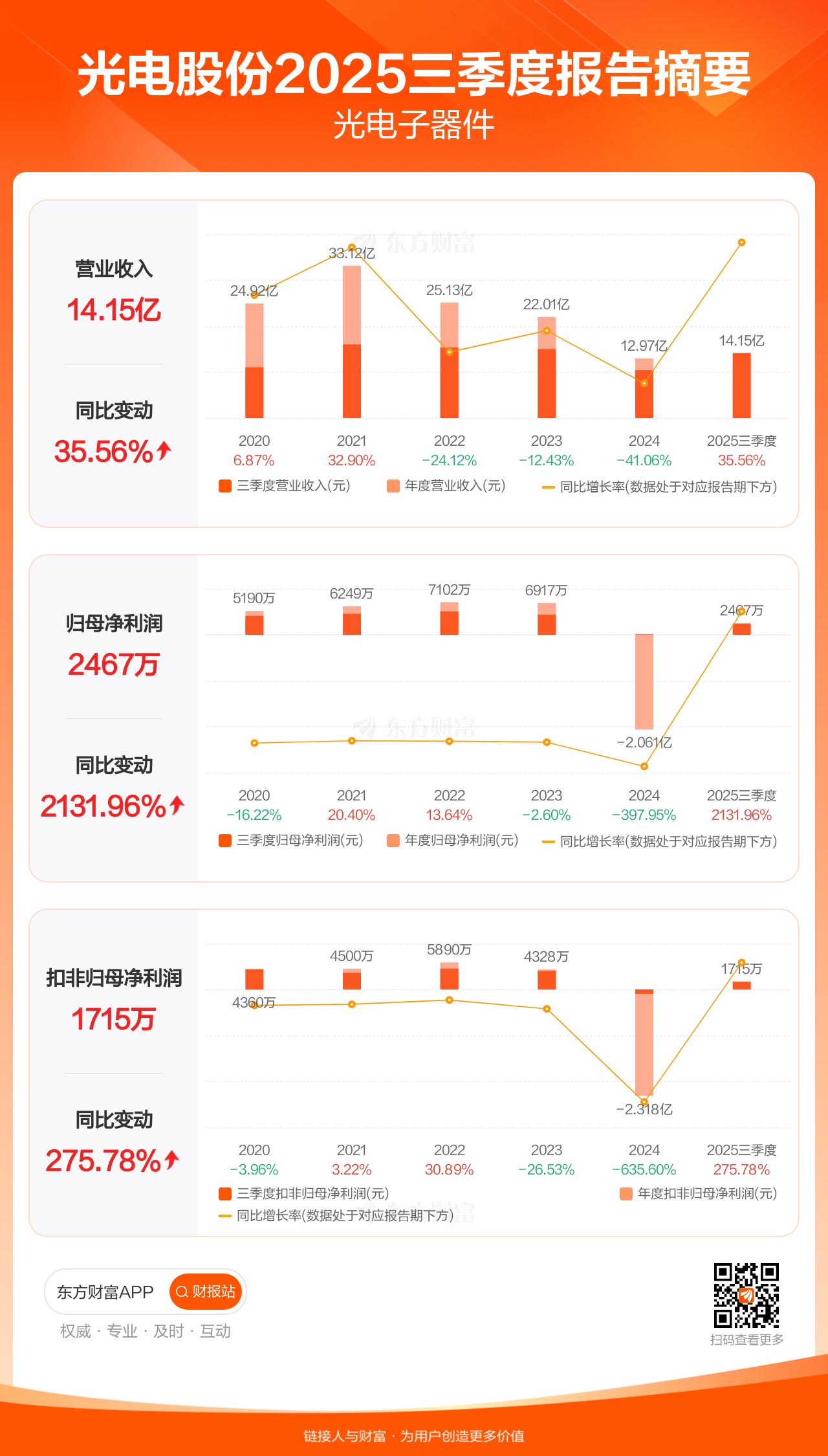 光电股份10月29日发布2025年三季报显示,公司前三季实现营业收入14.15亿元,同比增长35.56%;归母净利润2466.53万元,同比增长2131.96%;扣非归母净利润1715.00万元,同比增长275.78%。