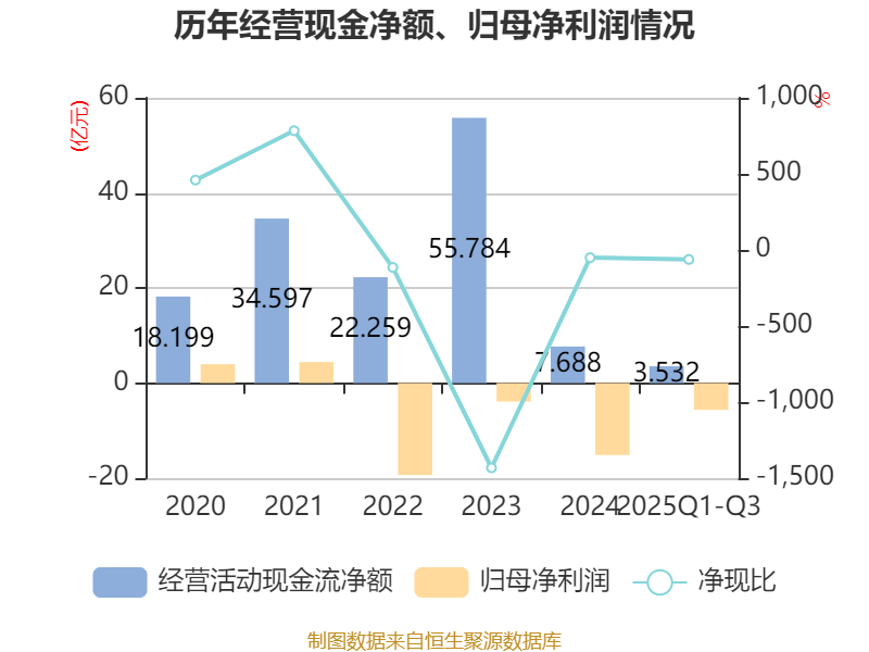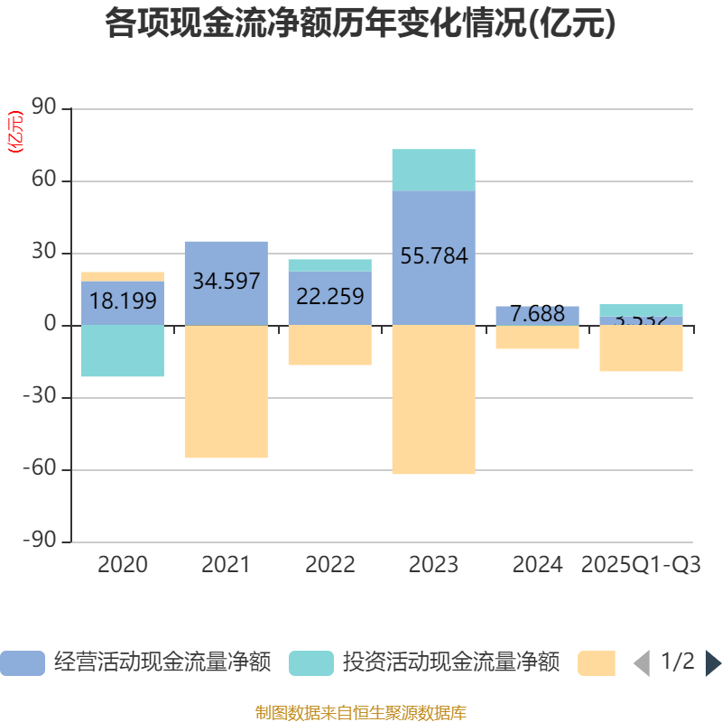 2025年前三季度,公司经营活动现金流净额为3.53亿元,同比下降58.44%;筹资活动现金流净额-19.28亿元,同比减少9.84亿元;投资活动现金流净额5.11亿元,上年同期为-117.48万元。