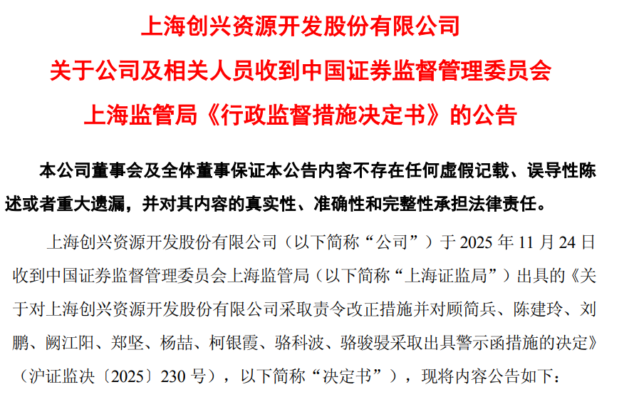 11月24日晚间,*ST创兴(600193)公告,公司于2025年11月24日收到上海证监局出具的《关于对上海创兴资源开发股份有限公司采取责令改正措施并对顾简兵、陈建玲、刘鹏、阙江阳、郑坚、杨喆、柯银霞、骆科波、骆骏骎采取出具警示函措施的决定》(以下简称《决定》)。