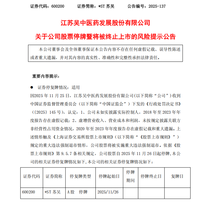 同一天,*ST苏吴收到上海证券交易所下发的《关于拟终止江苏吴中医药发展股份有限公司股票上市的事先告知书》《关于对江苏吴中医药发展股份有限公司、实际控制人暨时任董事长钱群山及有关责任人予以纪律处分的决定》。