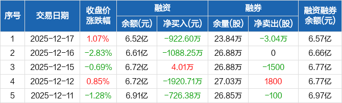 有研新材:融资净偿还922.6万元,融资余额6.52亿元(12-17)