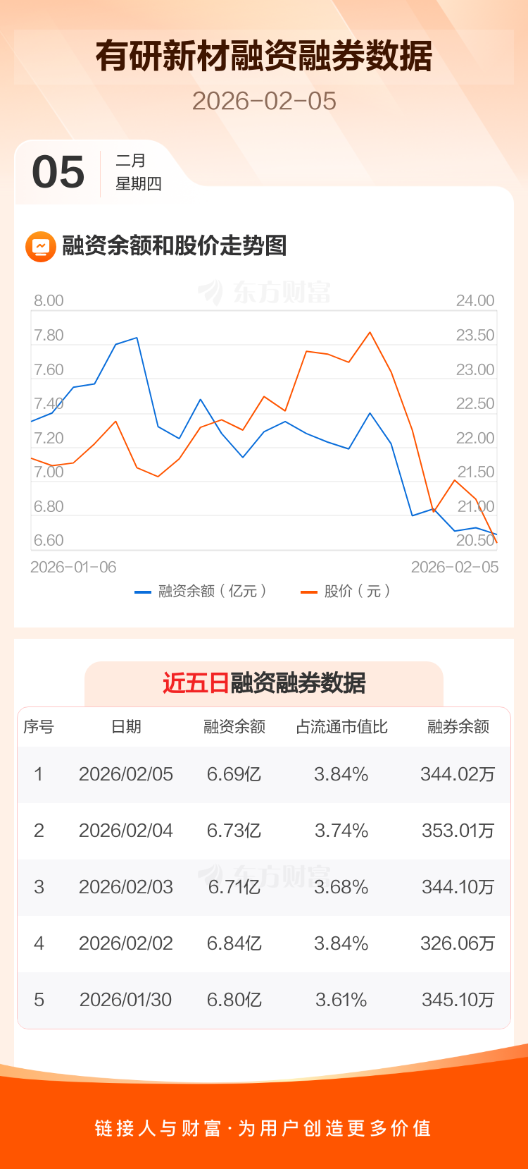 交易所最新数据显示,有研新材于2026年2月5日获融资买入3970.77万元,融资偿还4354.47万元,当日融资净偿还383.71万元。目前,该股融资余额6.69亿,占流通市值比例为3.84%。