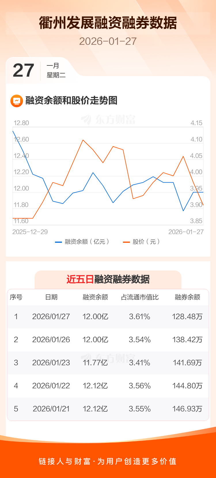 交易所最新数据显示,衢州发展于2026年1月27日获融资买入3710.72万元,融资偿还3722.06万元,当日融资净偿还11.34万元。目前,该股融资余额12.00亿,占流通市值比例为3.61%。
