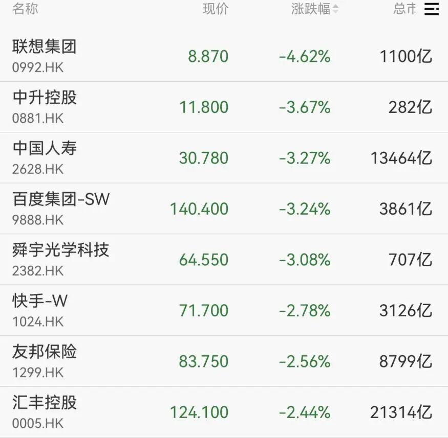 港股方面,恒指跌超1%,联想集团、中国人寿、百度集团等跌幅居前。