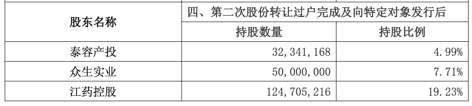 另外,上述交易完成后,泰容产投、众生实业持股数量将分别降至3234.1万股、5000万股,持股比例分别为4.99%、7.71%。