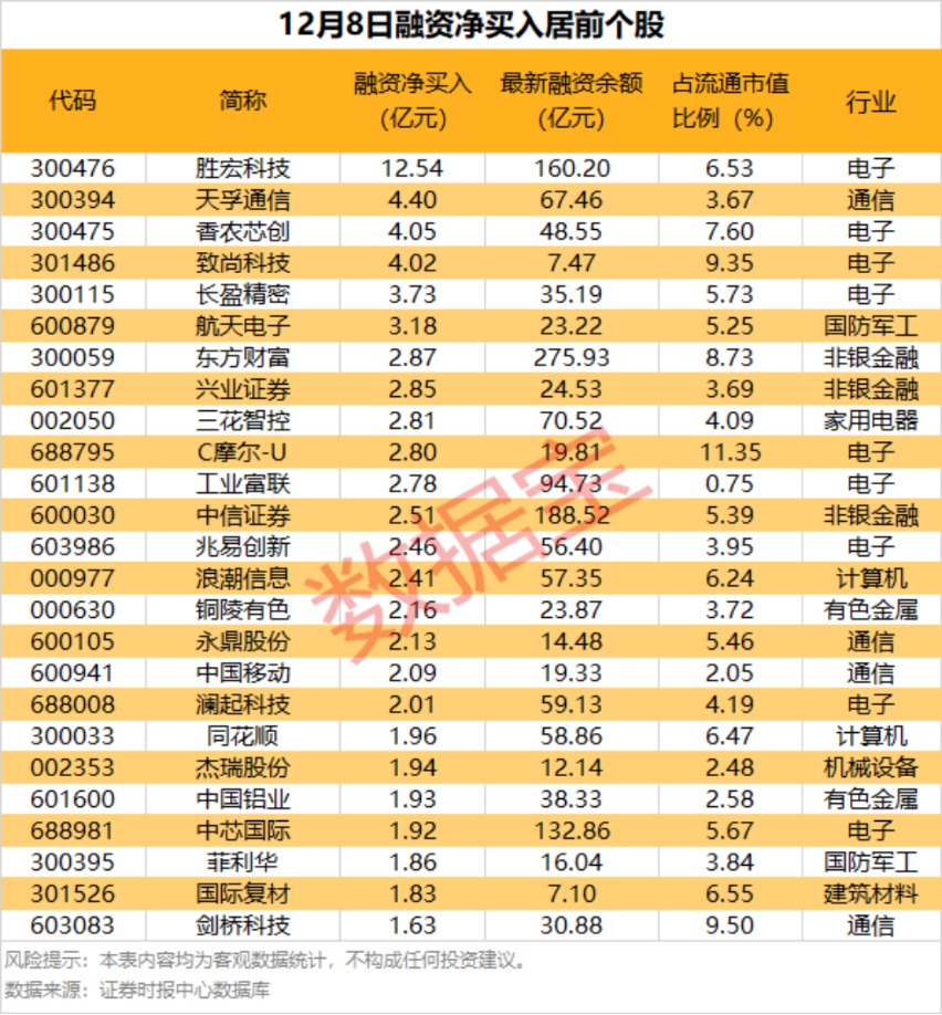具体到个股,12月8日获融资净买入千万元以上的有617只,其中49只融资净买入额超1亿元。胜宏科技融资净买入额居首,当日净买入12.54亿元;其次是天孚通信、香农芯创,融资净买入金额分别为4.40亿元、4.05亿元;融资净买入金额居前的还有致尚科技、长盈精密、航天电子等。