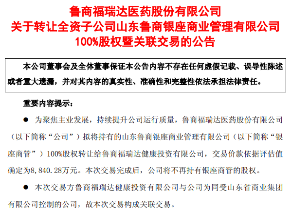 10月10日晚间,福瑞达披露,公司董事会已审议通过议案,拟将其持有的全资子公司山东鲁商银座商业管理有限公司(以下简称银座商管)100%股权,以8840.28万元的价格转让给鲁商福瑞达健康投资有限公司。