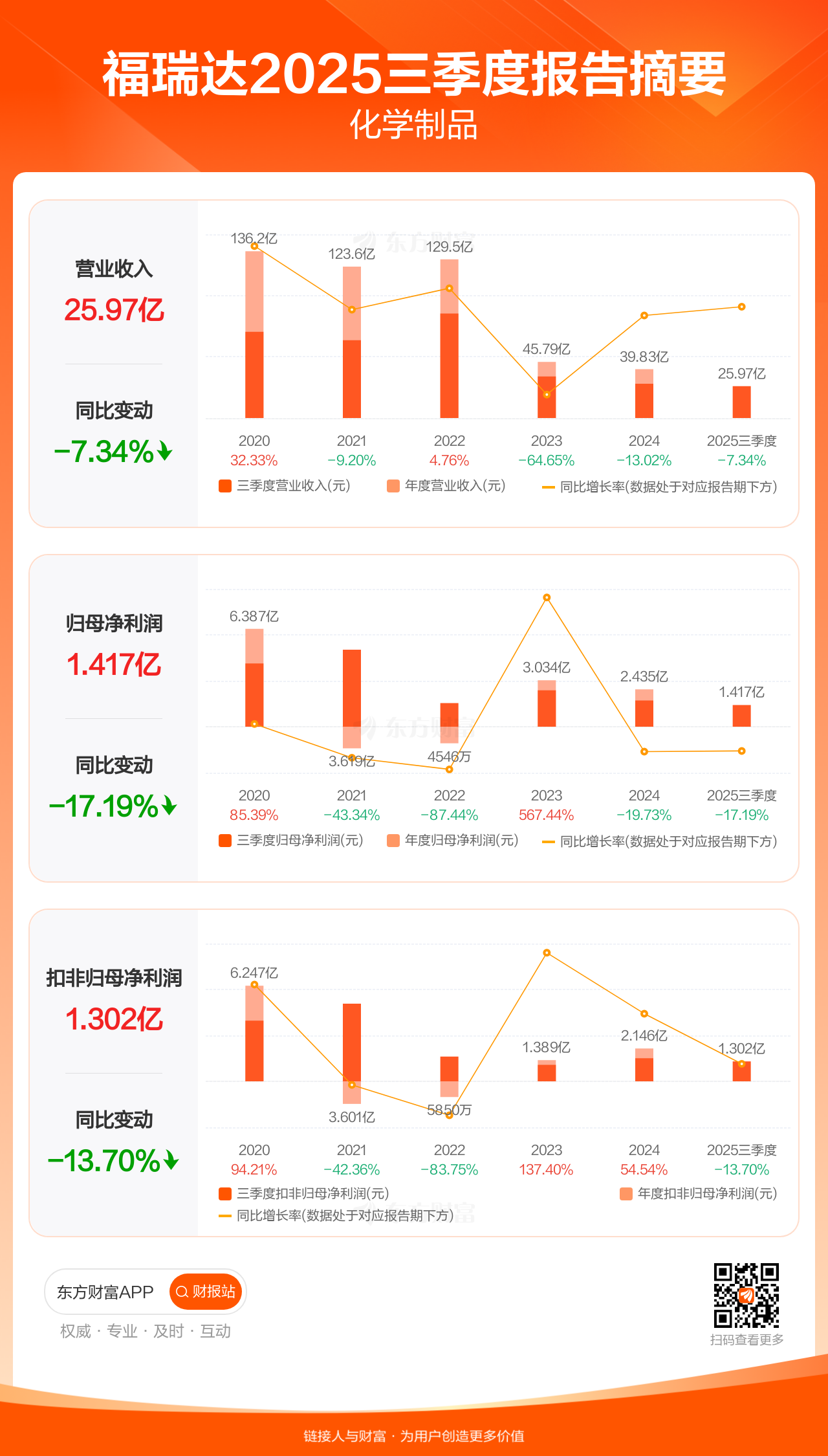 福瑞达10月28日发布2025年三季报显示,公司前三季实现营业收入25.97亿元,同比下滑7.34%;归母净利润1.42亿元,同比下滑17.19%;扣非归母净利润1.30亿元,同比下滑13.70%。