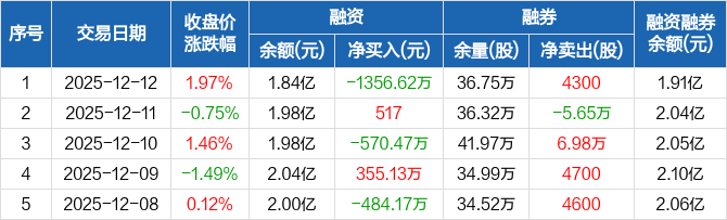 圆通速递融资融券信息显示,2025年12月12日融资净偿还1356.62万元;融资余额1.84亿元,创近一年新低,较前一日下降6.85%。