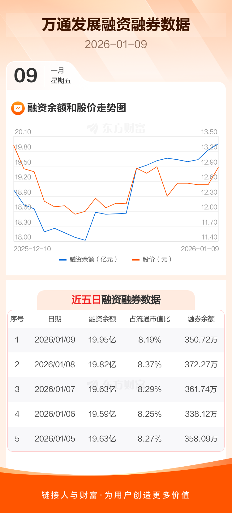 交易所最新数据显示,万通发展于2026年1月9日获融资买入1.41亿元,融资偿还1.28亿元,当日融资净买入1291.42万元。目前,该股融资余额19.95亿,占流通市值比例为8.19%。