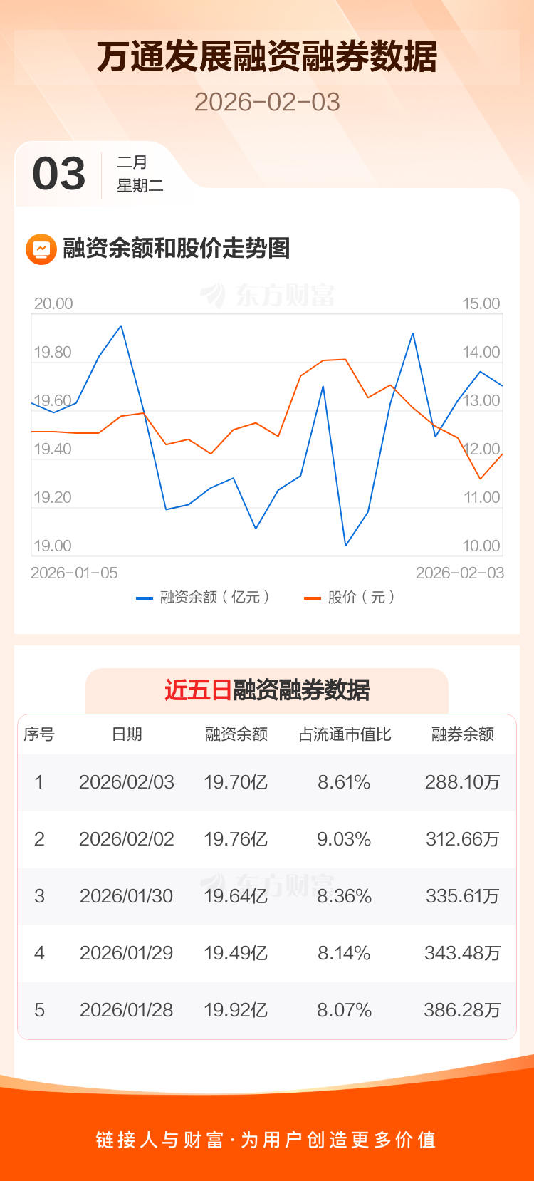 交易所最新数据显示,万通发展于2026年2月3日获融资买入7357.55万元,融资偿还7971.25万元,当日融资净偿还613.7万元。目前,该股融资余额19.70亿,占流通市值比例为8.61%。