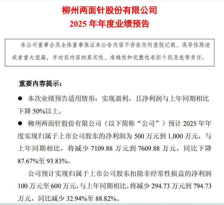 1月28日晚间,有“牙膏第一股”之称的两面针(600249)披露2025年年度业绩预告,公司预计2025年年度实现归属于上市公司股东的净利润为500万元到1,000万元,与上年同期相比,将减少7109.88万元到7609.88万元,同比下降87.67%至93.83%。