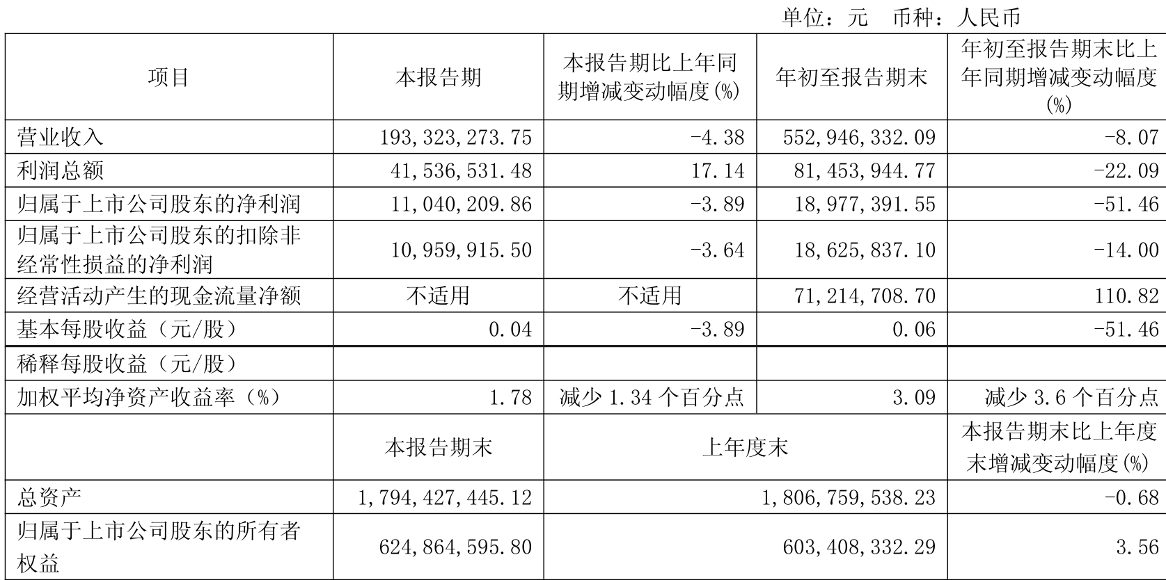中证智能财讯南京商旅(600250)10月30日披露2025年第三季度报告。前三季度公司实现营业总收入5.53亿元,同比下降8.07%;归母净利润1897.74万元,同比下降51.46%;扣非净利润1862.58万元,同比下降14.00%;经营活动产生的现金流量净额为7121.47万元,同比增长110.82%;报告期内,南京商旅基本每股收益为0.06元,加权平均净资产收益率为3.09%。
