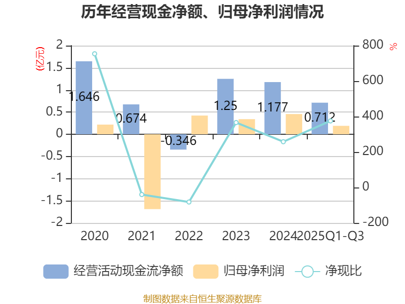 2025年前三季度,公司经营活动现金流净额为7121.47万元,同比增长110.82%;筹资活动现金流净额-7619.18万元,同比减少9299.32万元;投资活动现金流净额-8426.75万元,上年同期为-3649.12万元。