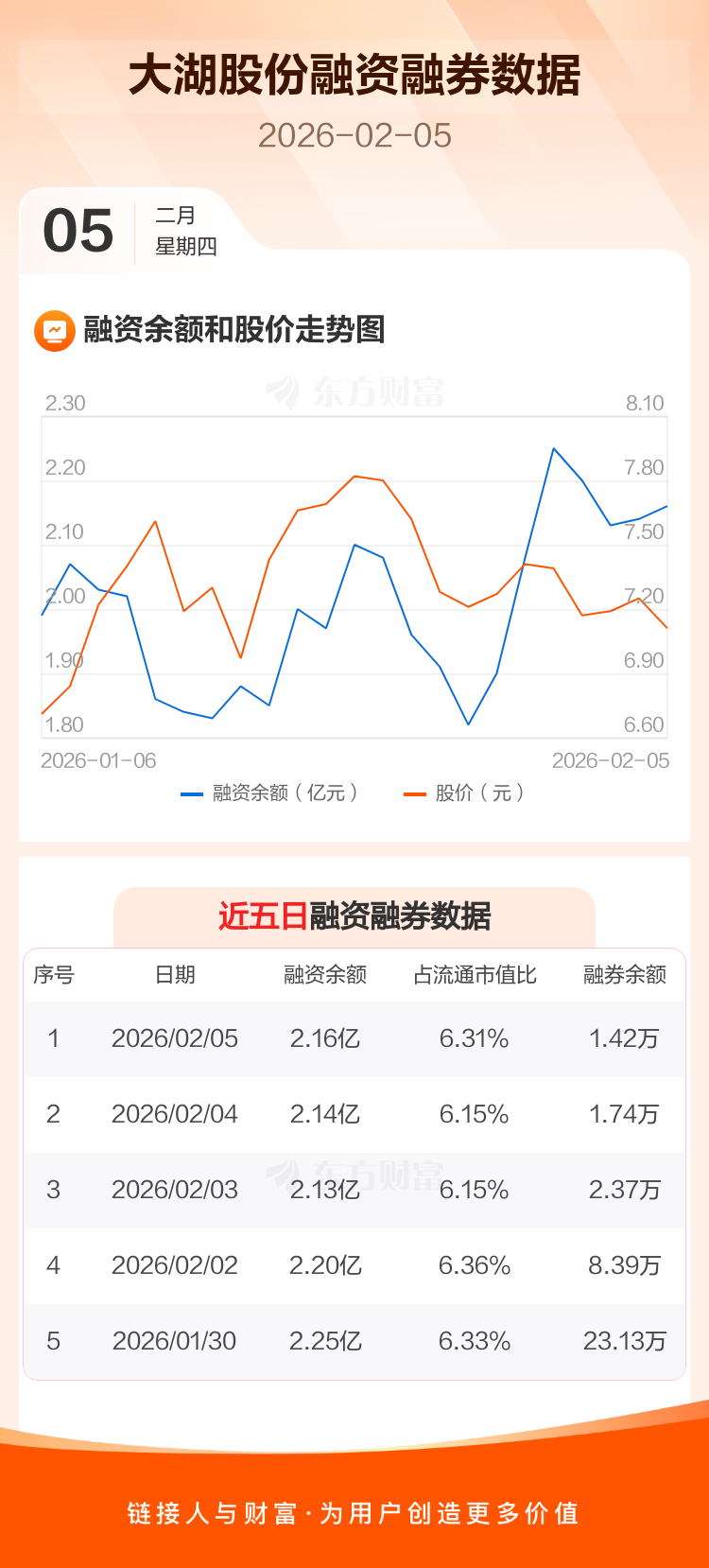 交易所最新数据显示,大湖股份于2026年2月5日获融资买入1044.79万元,融资偿还896.16万元,当日融资净买入148.63万元。目前,该股融资余额2.16亿,占流通市值比例为6.31%。