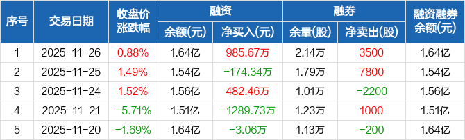 融资方面,当日融资买入1481.41万元,融资偿还495.74万元,融资净买入985.67万元。融券方面,融券卖出9400股,融券偿还5900股,融券余量2.14万股,融券余额7.34万元。融资融券余额合计1.64亿元。