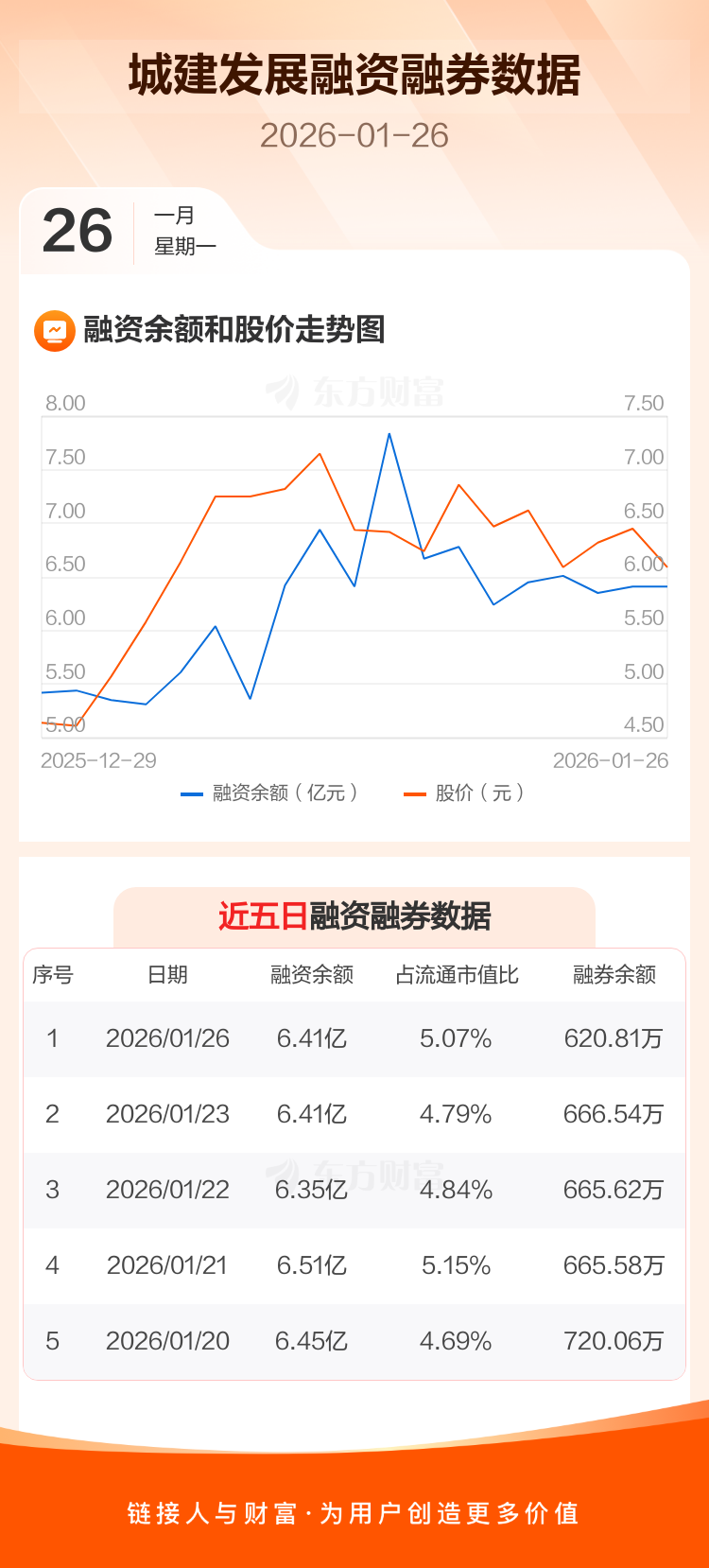 交易所最新数据显示,城建发展于2026年1月26日获融资买入1.05亿元,融资偿还1.05亿元,当日融资净偿还8.03万元。目前,该股融资余额6.41亿,占流通市值比例为5.07%。