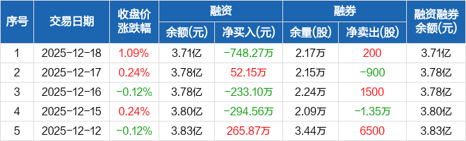 融资方面,当日融资买入1216.49万元,融资偿还1964.76万元,融资净偿还748.27万元。融券方面,融券卖出2000股,融券偿还1800股,融券余量2.17万股,融券余额18.12万元。融资融券余额合计3.71亿元。