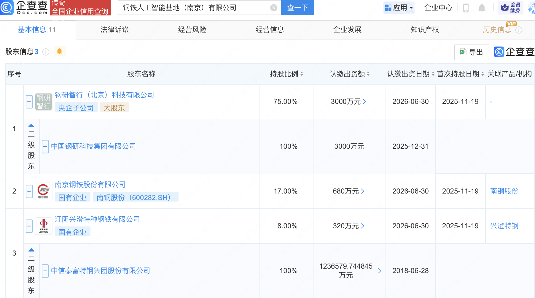 上证报中国证券网讯(记者秦春刚)记者从企查查APP获悉,11月19日,由南钢股份、中信特钢全资子公司江阴兴澄特种钢铁有限公司与中国钢研科技集团旗下钢研智行(北京)科技有限公司共同出资设立的钢铁人工智能基地(南京)有限公司正式成立,将聚焦钢铁行业智能化转型核心需求,展开业务布局,标志着国内钢铁行业龙头企业携手布局人工智能领域迈出实质性步伐。